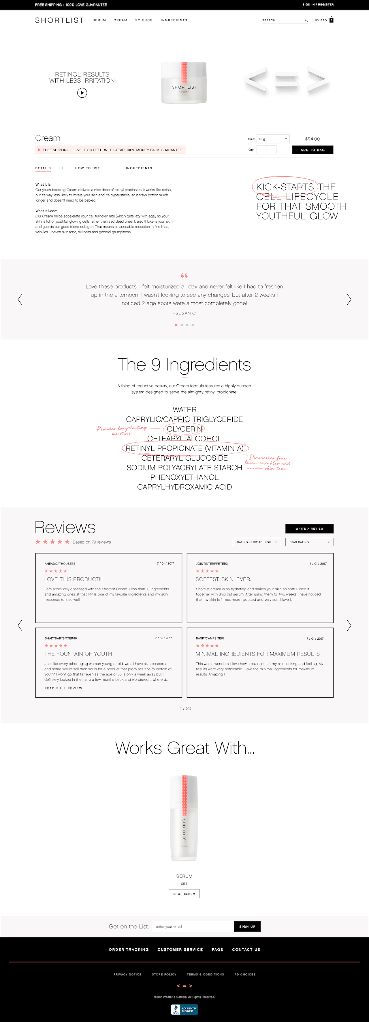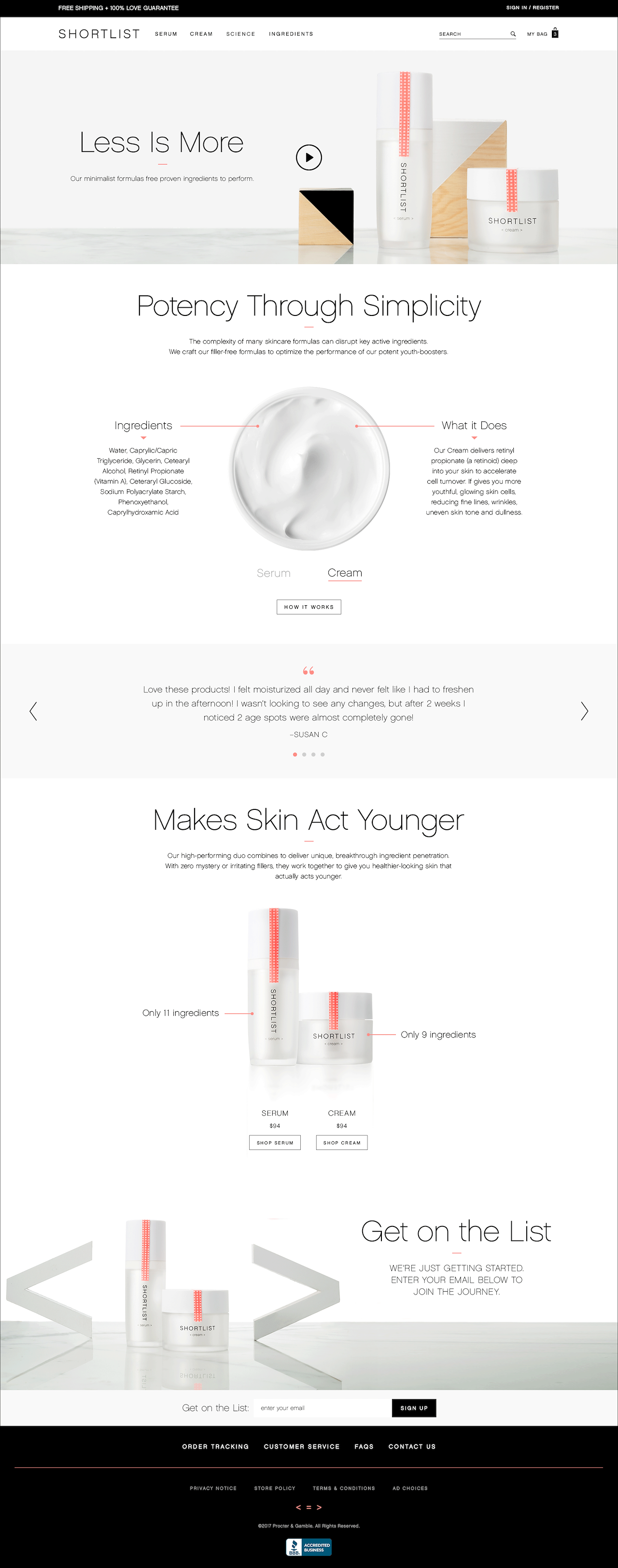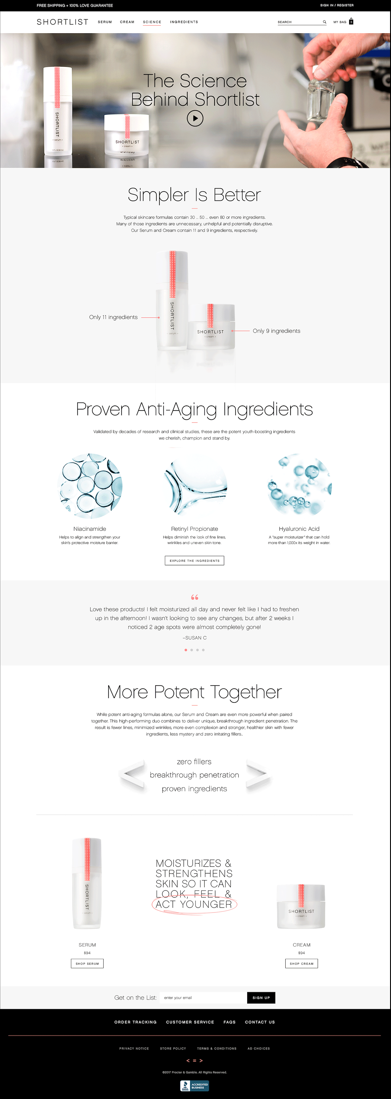 Shortlist is a new brand from the labs of Olay and SK-II at Procter & Gamble. Using only scientifically proven anti-aging in the simplest formulas possible, the brand offers a potent but minimalist approach to skincare.